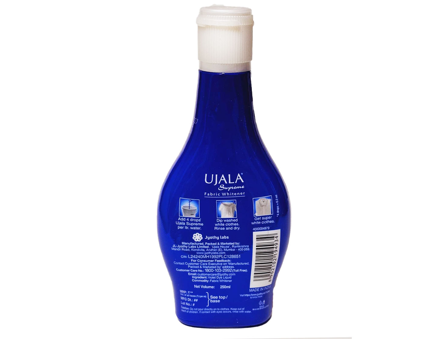 Ujala Supreme features Ultra Radiance Molecules that dissolve quickly and penetrate deeply, ensuring your clothes achieve dazzling whiteness instantly. Just four drops per liter of water deliver unmatched whiteness with uniform, consistent results every time.