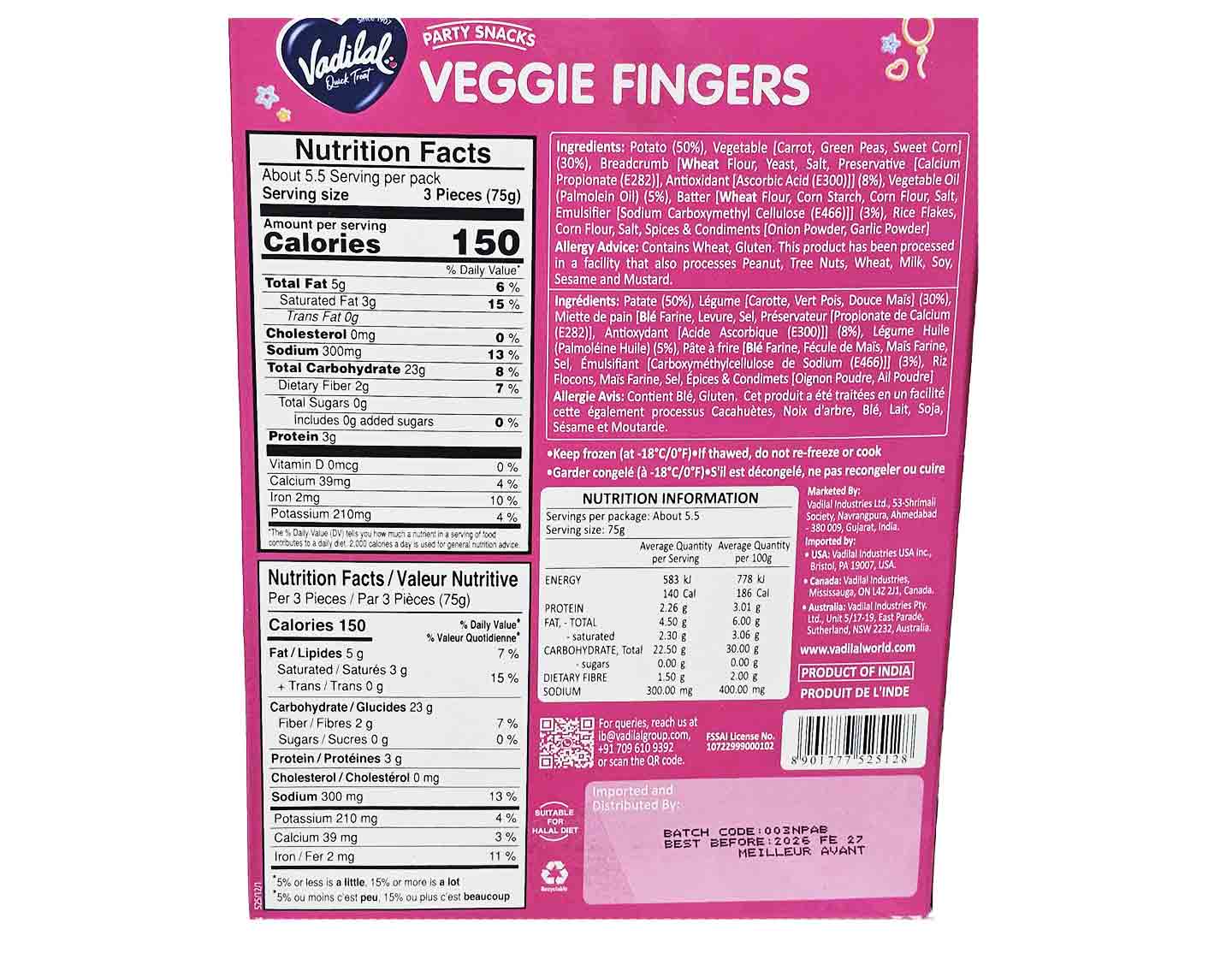 Vadilal Frozen Veggie Fingers are crispy and delicious vegetable snacks, made from a blend of vegetables and spices. These finger-shaped bites are perfect for appetizers or snacks, offering convenience and easy preparation for any time.