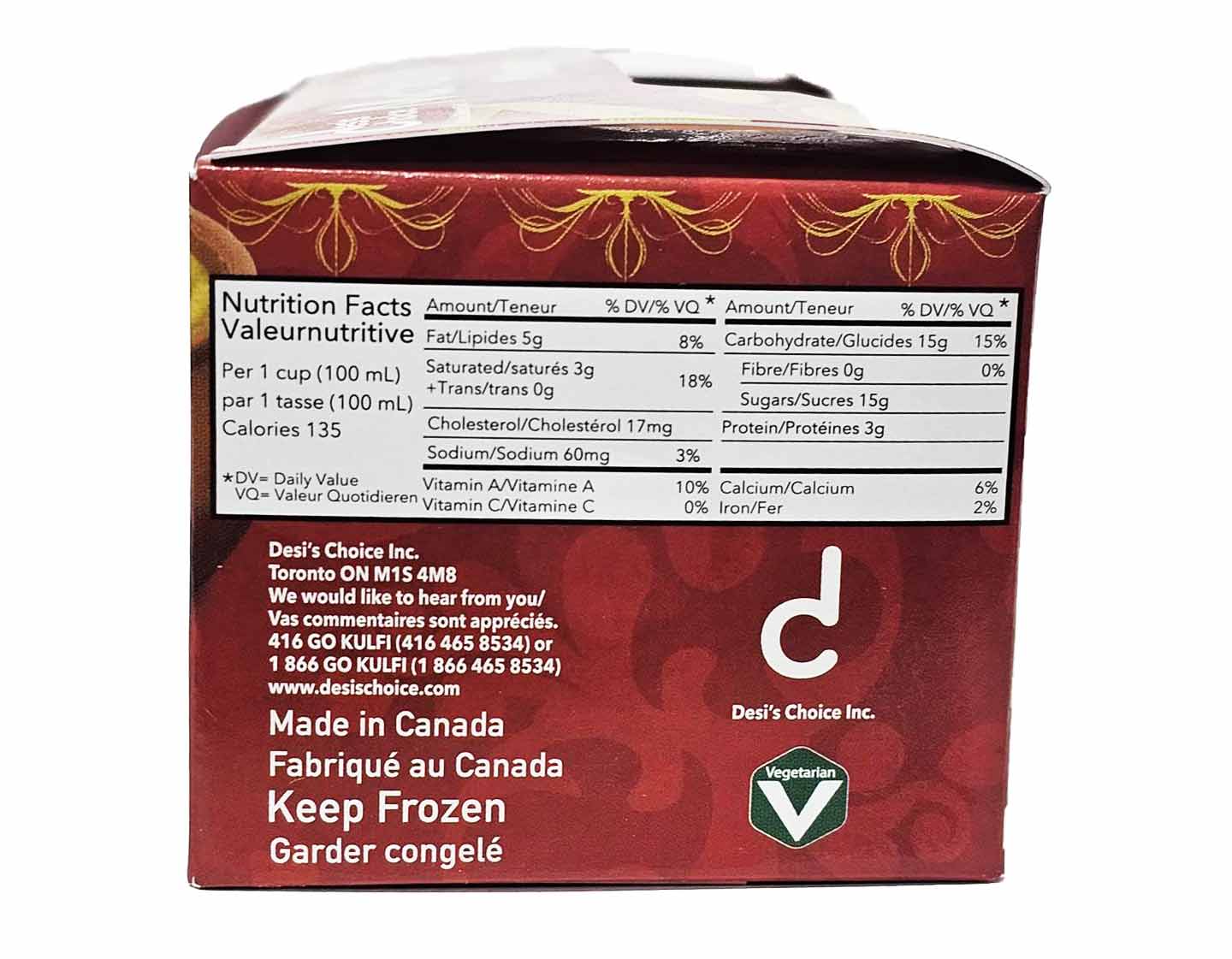 Desi's Choice Matka Mango Kulfi is a frozen dessert made from Alphonso mangoes. It has a dense texture and smooth consistency. Other flavors include pista, almond, malai wali, and rabri malai. Available in various sizes.