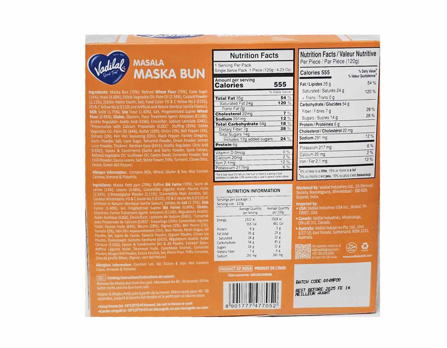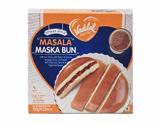 Vadilal Masala Maska Bun is a soft, buttered bun filled with a spicy vegetable mixture, including potatoes, peas, and aromatic spices like cumin and coriander. This savory Indian snack is perfect for tea-time or a quick, flavorful bite.