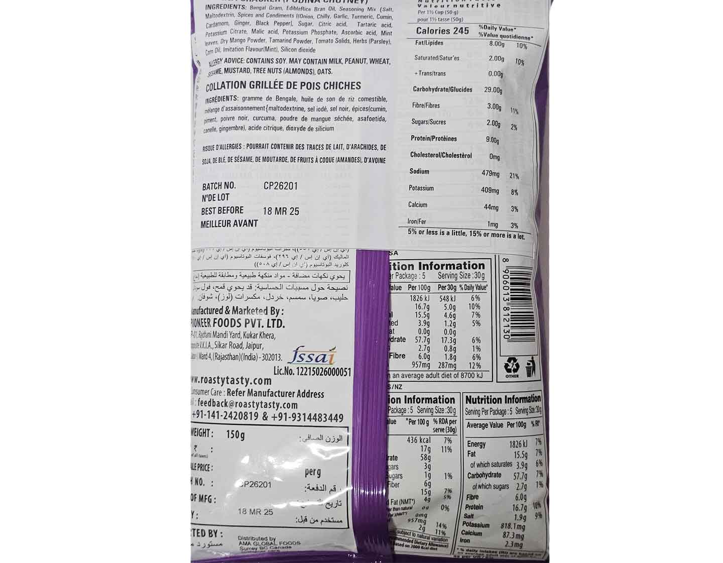 Enjoy the wholesome crunch of Roasty Tasty Chana Cracker, a diet-friendly, oil-free snack made from roasted Bengal Gram. Flavored with Heeng and Jeera, it's rich in protein, cholesterol-free, and preservative-free for a healthy, guilt-free treat.