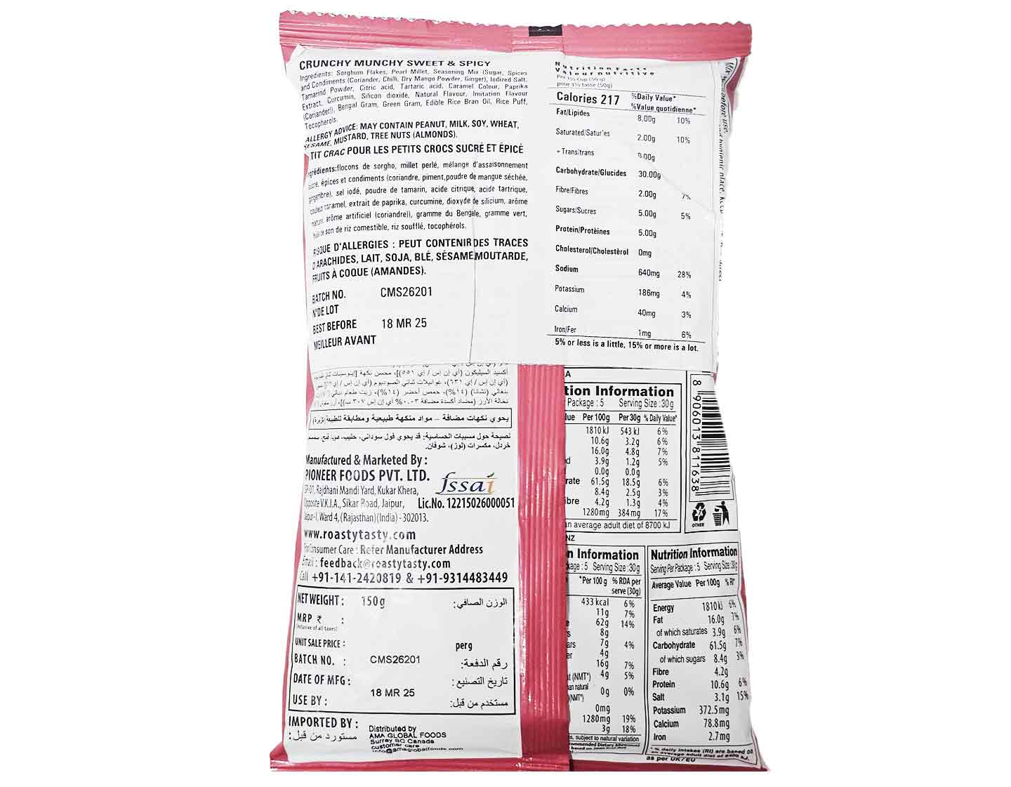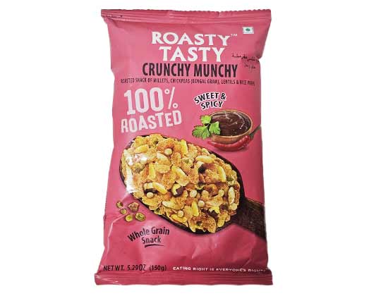 Enjoy a guilt-free millet crunch, a 100% roasted, non-fried snack. It's palm oil-free, with no cholesterol or trans fats, and contains no onion or garlic. A delicious and healthy snacking option for your cravings!