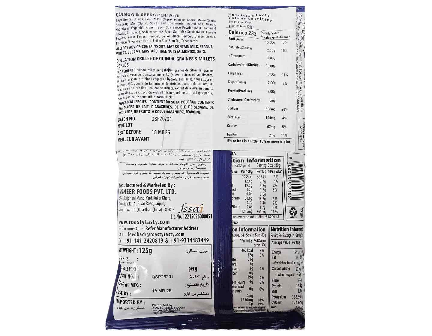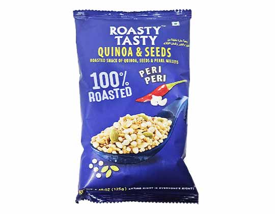 This crunchy mix combines quinoa puffs, bajra puffs, melon seeds, and pumpkin seeds, all 100% roasted and non-fried. Packed in a resealable ziplock pouch, it features a bold and zesty peri peri flavor for a tasty, guilt-free snack.
