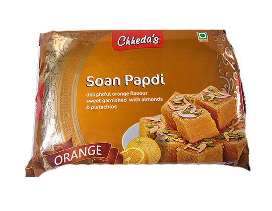 Chheda's Orange Soan Papdi is a traditional Indian sweet with a flaky texture, infused with tangy orange flavor. Crafted from gram flour, sugar, and ghee, it offers a delightful citrus twist.
