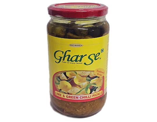 GharSe Lime & Green Chilli Pickle is a tangy, spicy blend made from handpicked limes and fresh green chillies. This traditional Indian pickle is packed with bold flavors, perfect for enhancing meals with its zesty kick and authentic homemade taste.