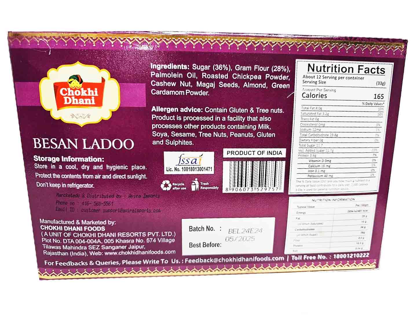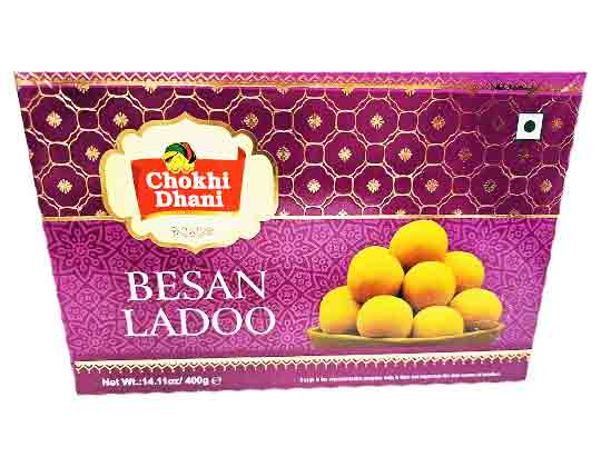 Chokhi Dhani Foods presents Besan Laddu, a popular sphere-shaped Indian sweet made from chickpea flour (besan), sugar, and ghee. This traditional delicacy is known for its rich flavor, originating from the Indian subcontinent.