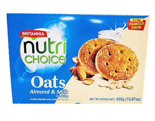 Britannia NutriChoice Oats Milk Almond Cookies are a tasty and healthy snack made with rolled oats, wheat bran, almonds, and milk. Rich in fiber, these cookies are an ideal choice for a wholesome, anytime snack.