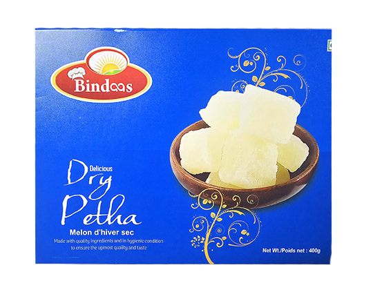 Bindas Dry Petha is a traditional Indian sweet made from ash gourd (white pumpkin). It has a crystallized sugar coating, offering a chewy texture and a rich, sweet flavor with a refreshing taste.