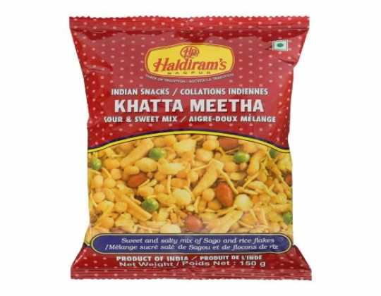 Haldirams Khatta Meetha 150g offers a delightful and balanced snack mix. This blend combines savory and sweet elements such as crispy noodles, peanuts, lentil flour sticks, and a mix of spices.
