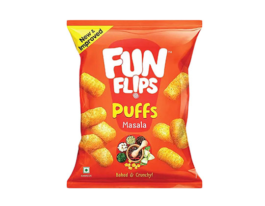 Fun Flips Puffs Masala is a crispy, spicy snack bursting with tangy masala flavor. Light and crunchy, it's perfect for anytime munching, delivering a delicious blend of spices in every bite!