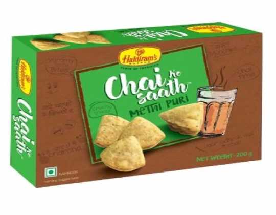 Haldirams Methi Puri is a savory Indian snack made from a blend of wheat flour, fenugreek leaves, and aromatic spices. Each 200g pack is perfect for enjoying as a light snack or pairing with your favorite chutney or pickle.