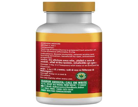 Dabur Amla Churna is a natural herbal powder made from dried Amla (Indian gooseberry), known for its rich vitamin C content. It supports digestion, boosts immunity, promotes healthy hair, and acts as an antioxidant for overall well-being.
